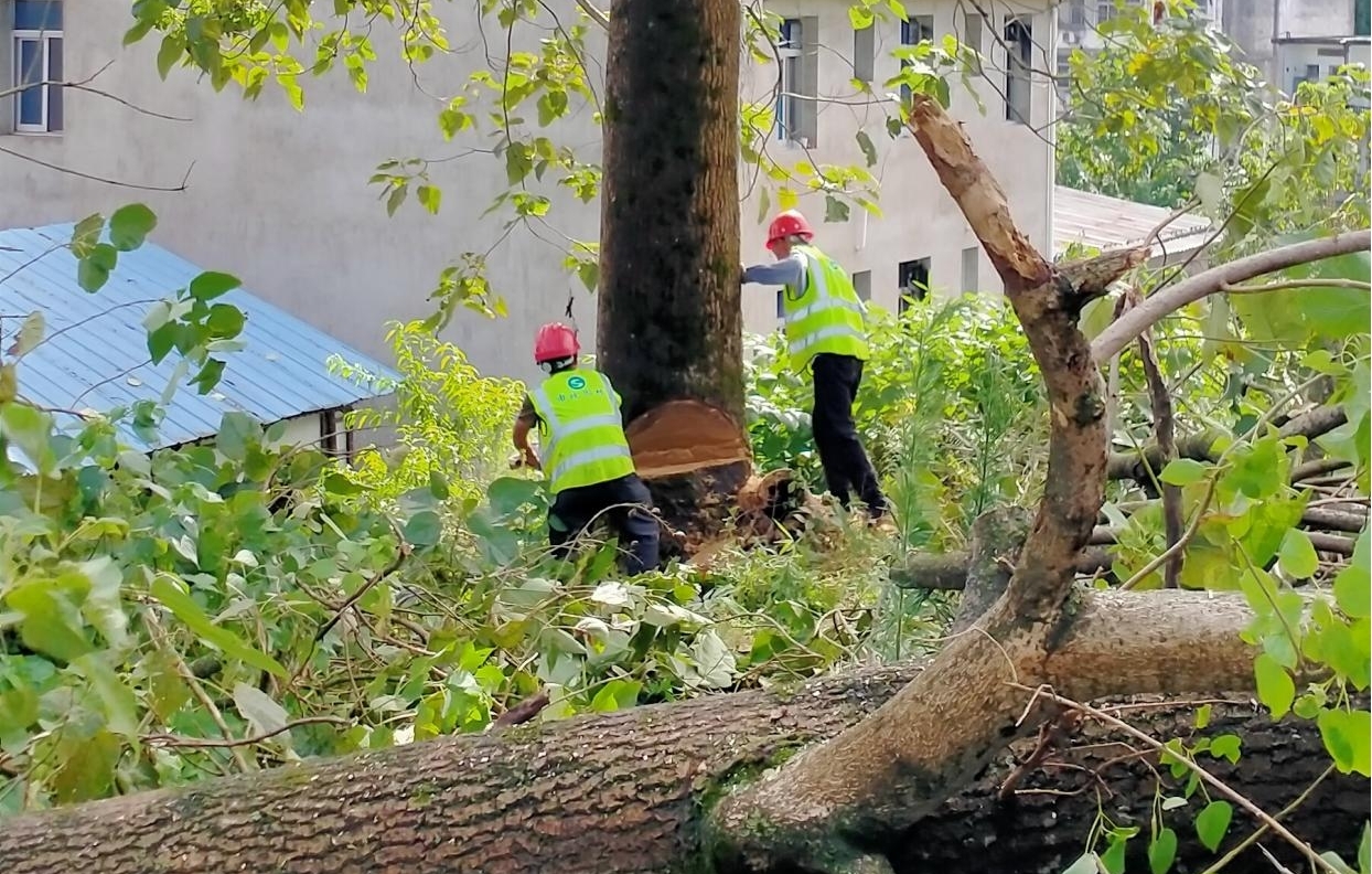 8月6日,市政園林公司派出12名城市運(yùn)維人員,攜帶油鋸、折疊梯和鋼絲繩開展安全隱患排除工作。到達(dá)現(xiàn)場(chǎng)后,運(yùn)維人員首先疏導(dǎo)周邊行人,設(shè)置施工警示標(biāo)志,安全管理人員按照安全生產(chǎn)有關(guān)要求督導(dǎo)運(yùn)維人員安全生產(chǎn),確保施工過(guò)程安全無(wú)事故。
