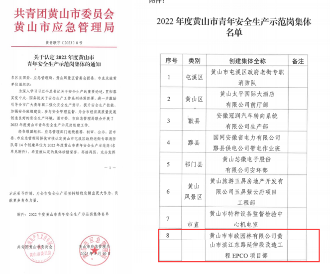 日前,共青團黃山市委、應急管理局聯(lián)合組織開展的“2022年度黃山市青年安全生產(chǎn)示范崗”評選結(jié)果揭曉,市政園林公司黃山市濱江東路延伸段改造工程EPCO項目部以奮發(fā)有為的青春風貌、卓越突出的工作業(yè)績、扎實有效的創(chuàng)建活動,成功脫穎而出獲此殊榮。